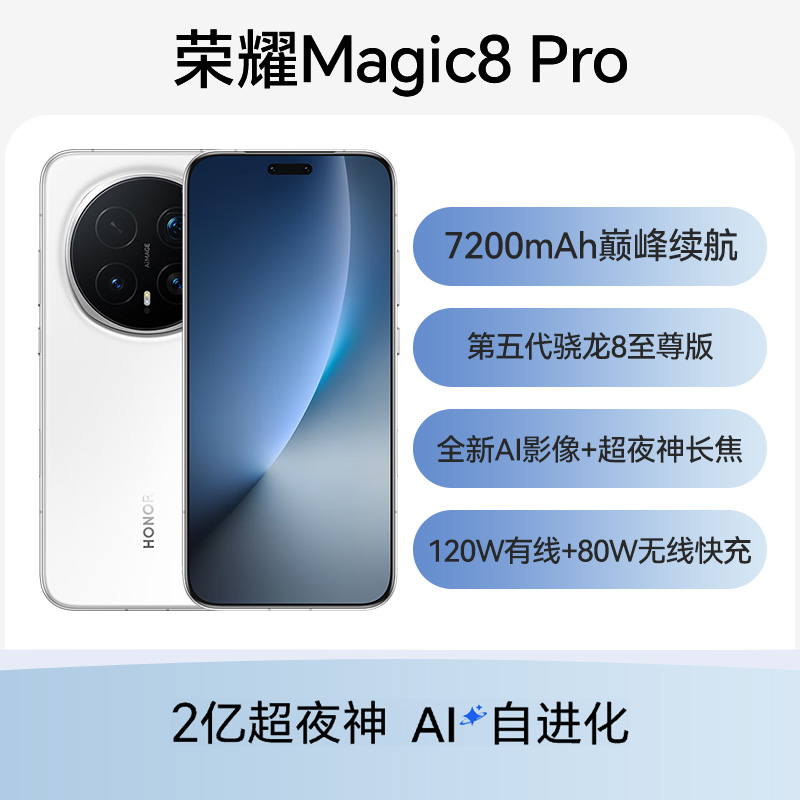 荣耀Magic8 Pro 全网通5G版 雪域白 16GB+512GB 2亿超夜神,AI自进化;7200mAh巅峰续航;第五代骁龙8至尊版;全新AI影像+超夜神长焦;