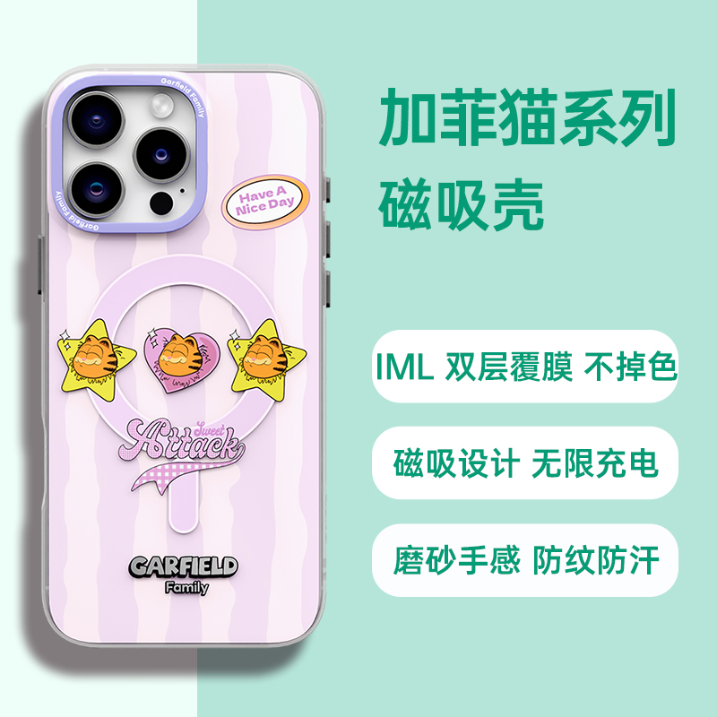 QEE iPhone 16 Pro Max 加菲猫系列 磁吸保护壳 美式紫色 可爱萌宠图案,磁吸稳固防护,让爱机个性十足