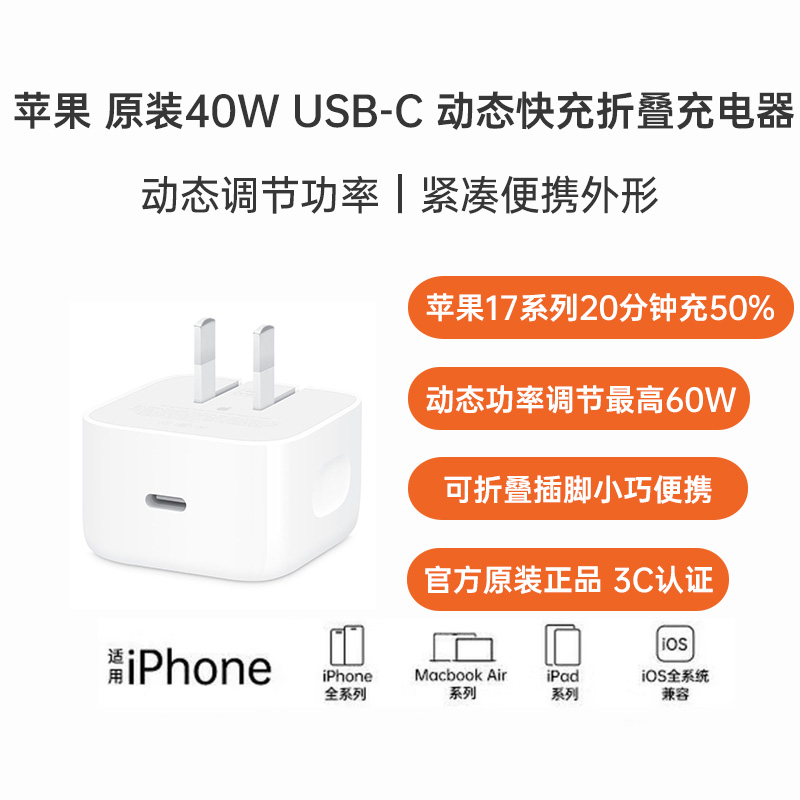 【适配iPhone 17系列】苹果 原装40W USB-C 动态快充折叠充电器 最高60W 白色 动态调节功率,紧凑便携外形, iPhone 17 各款机型约 20 分钟最高可充到 50%电量, iPhone Air约 30 分钟最高可充到 50% 电量,兼容支持 USB-C 的设备