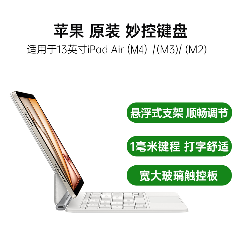苹果 原装 妙控键盘 适用于13英寸 iPad Air M4/M3/M2 白色 造型优美又十分便携,打字手感妙不可言。键盘设有一整排14个功能键,自带支持直通充电的 USB-C 接口,还能为 iPad 机身前后提供妥帖保护。悬浮式支架设计,可顺畅调节至多个观看角度;宽大的玻璃触控板拓展了 iPadOS 的互动方式。