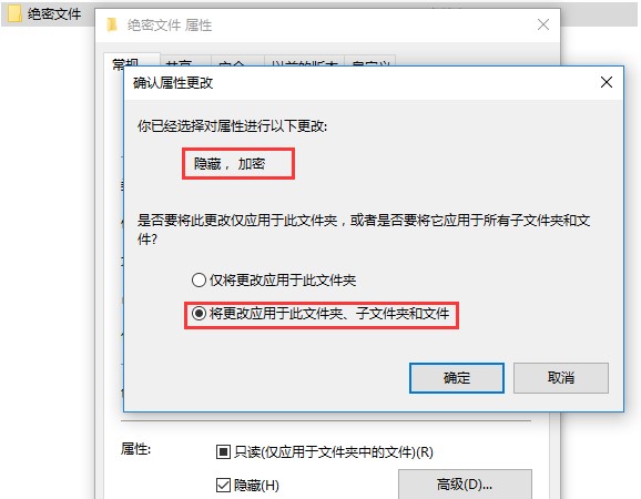 5、勾选加密以后会自动返回属性界面,我们把隐藏勾选以后点击应用会弹出一个确认的窗口,有两个选项,第一个是仅对此文件夹进行隐藏加密,第二项是对此文件夹和该文件下的所有内容进行隐藏和加密。我们选择第二项点击确定文件夹就会隐藏了。